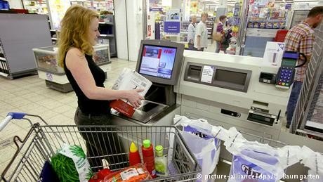 Во многих немецких супермаркетах терминалы самообслуживания постепенно заменяют кассиров. Покупатели могут сами отсканировать штрих-коды на товарах, взвесить фрукты и овощи, а потом рассчитаться наличными или банковской карточкой.