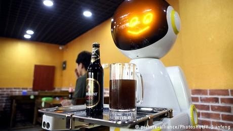 В некоторых ресторанах Китая вместо обслуживающего персонала используют таких роботов. Они могут принимать заказы, приносить еду и выставлять счет. Машины работают около семи часов без дополнительной подзарядки.