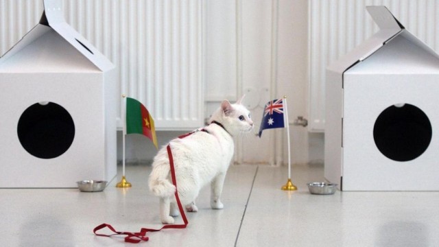 С тихим мяуканьем белый кот по имени Ахилл лениво смотрит на две миски с кормом, украшенные национальными флагами России и Саудовской Аравии.